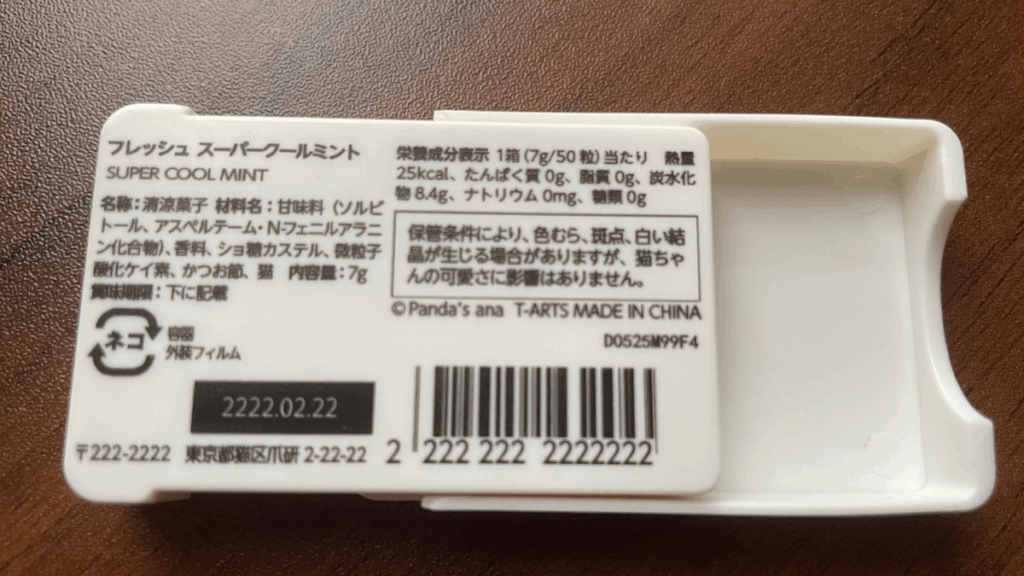 商品バーコードなどの数字が2(=にゃん)で統一されていますし、注意事項のような枠の中には、このような記載がされていました。