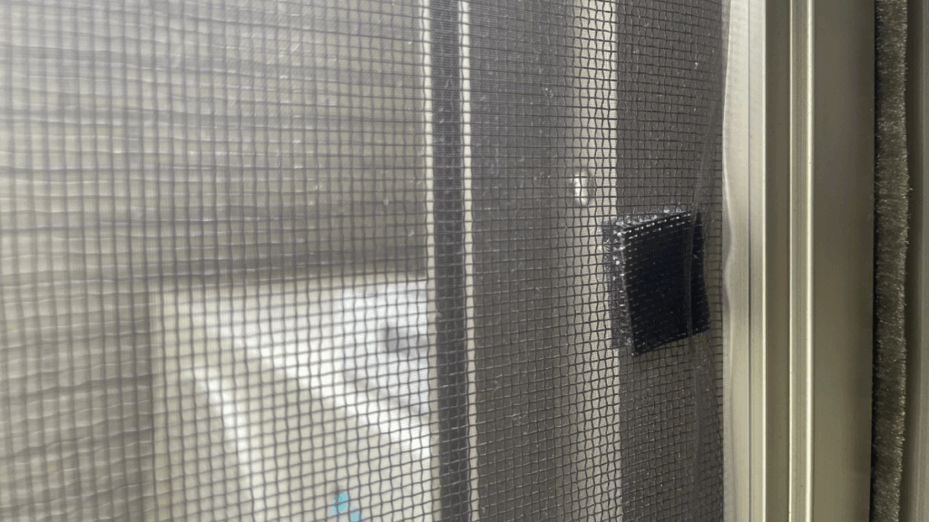 実際の網戸のサイズとぴったりの大きさだと引っ張った時に若干ズレが生じてしまう場合もあるので、少し長めにカットして最終的に貼り付けてから一部長い部分をカットした方が私としてはやりやすかったです。